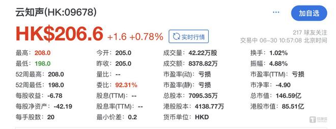 截至发稿前,云知声股价206.6港元/股,最新总市值146.59亿港元。