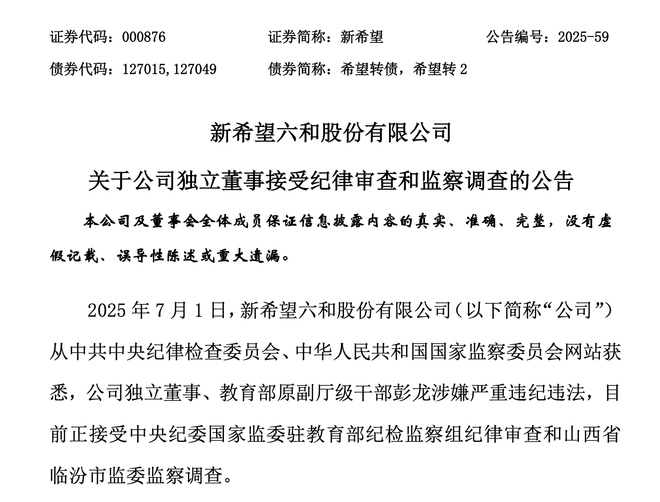 新希望六和股份有限公司发布公告称,公司从中共中央纪律检查委员会、中华人民共和国国家监察委员会网站获悉,公司独立董事、教育部原副厅级干部彭龙涉嫌严重违纪违法,目前正接受中央纪委国家监委驻教育部纪检监察组纪律审查和山西省临汾市监委监察调查。