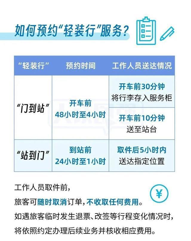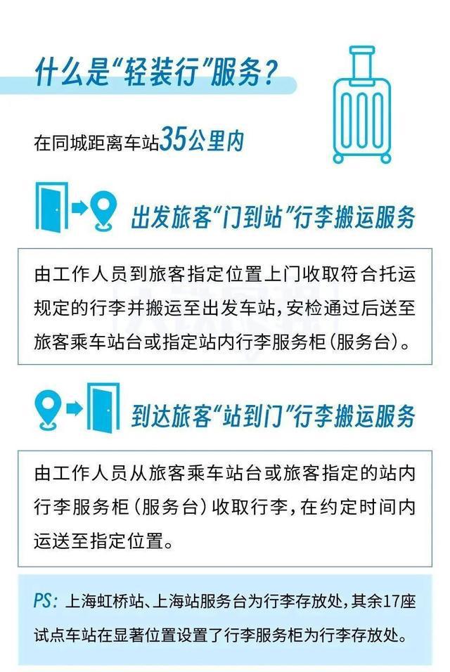 自6月28日起在北京西、北京南、上海虹桥、上海、杭州东、杭州、合肥南、广州南、深圳北、长沙南、成都东、成都西、昆明、昆明南、大理、丽江、保山、普洱、西双版纳等19座车站试点此项服务。