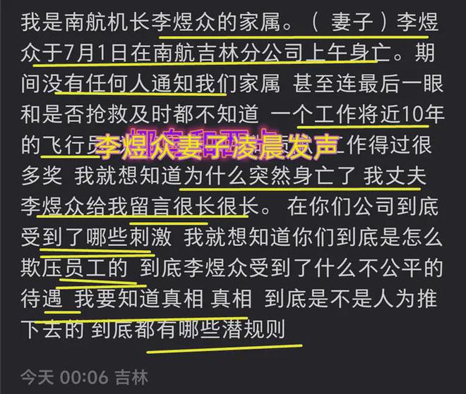 南航机长李某某伤人后跳楼身亡,其妻子今天发声,相关内容曝出