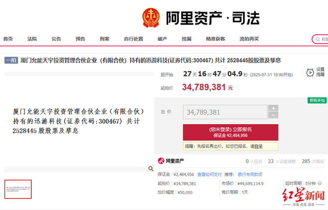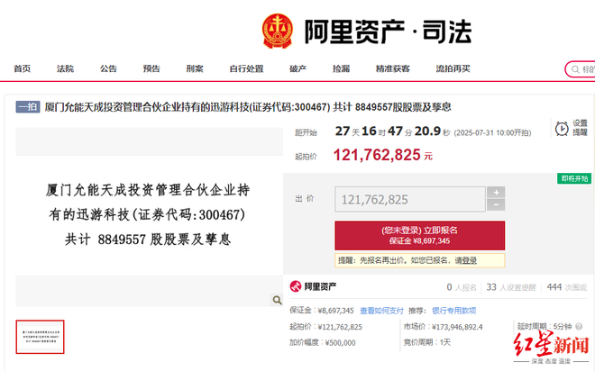 微成都报道7月1日,迅游科技(300467.SZ)发布公告,公司合计持股5%以上股东厦门允能天成投资管理合伙企业(有限合伙)和厦门允能天宇投资管理合伙企业(有限合伙)所持公司全部股份将被四川省成都市中级人民法院在淘宝司法拍卖网络平台公开拍卖。