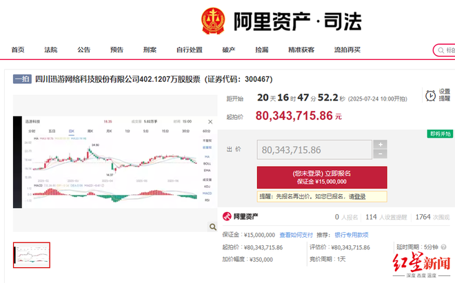 迅游科技称,本次司法拍卖尚在公告阶段,后续可能涉及竞拍、缴款、法院执行法定程序、股权变更过户等步骤环节,并且存在流拍风险,最终拍卖能否成功存在不确定性。如果本次司法拍卖成功并完成过户登记,陈俊持股比例将降至4.46%。