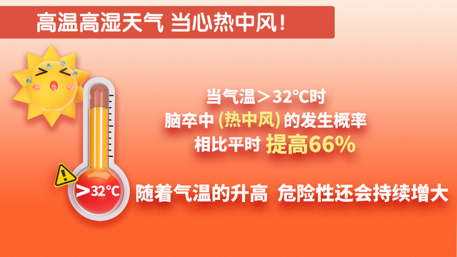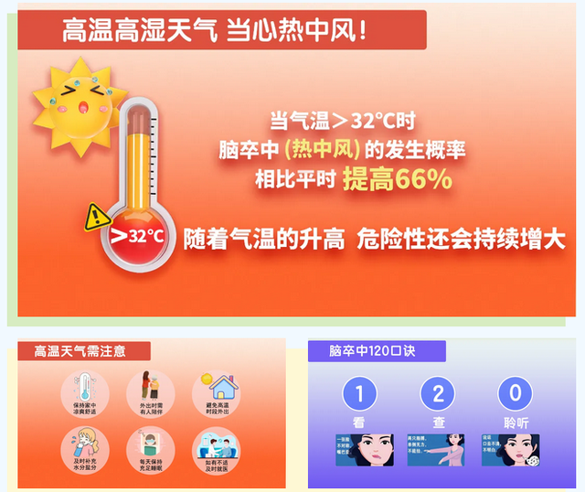 高温高湿的天气会增加脑卒中等心脑血管疾病的发病风险。河南省气象服务中心、河南省卒中学会、河南省脑卒中防治中心联合提醒:夏季预防脑卒中非常重要:要尽量避免高温时段外出,使用空调时温度不宜过低;注意清淡饮食、规律作息。有相关基础疾病的人群,做好身体监测,出现症状可以先用“脑卒中120口诀”初步判断,及时及早就医。