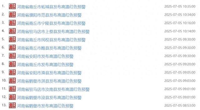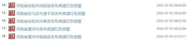 今天河南大部地区被37-39℃的高温笼罩,中东部局地超40℃,截止到今天中午12点,河南百余个高温预警生效中,其中商丘、安阳、鹤壁、驻马店、漯河等部分地区还发布了最高级别的红色预警。