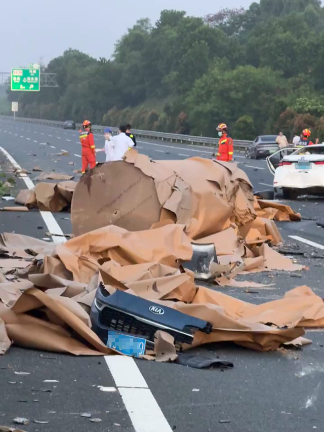 红星新闻记者注意到,在多名网友发布的现场视频中,有多辆汽车不同程度受损,其中一辆厢式货车的车厢甚至从后部被直接撕裂开,在路上可以看到涉事货车运输的大型纸卷跌落在路面。