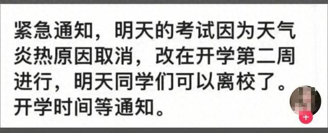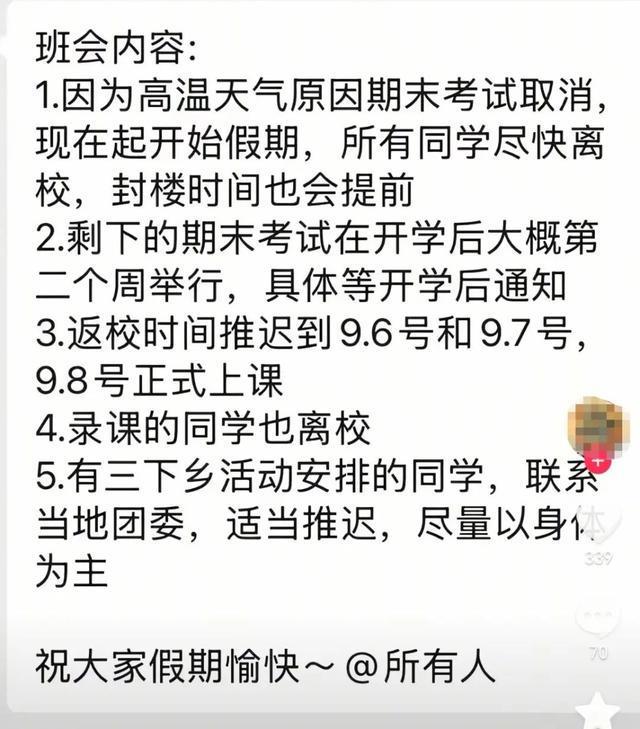 极目新闻记者注意到,网上多位自称是山外学子和学长的网友5日晚在社交媒体上发文,有的展示“紧急通知”,称6日的考试因天气炎热取消,改在开学第二周举行,同学们可以离校。有的展示了“班会内容”:1.因为高温天气原因期末考试取消,现在起开始假期,所有同学尽快离校,封楼时间也会提前;2.剩下的期末考试在开学后大概第二个周举行,具体等开学后通知;3.返校时间推迟到9.6号和9.7号,9.8号正式上课。