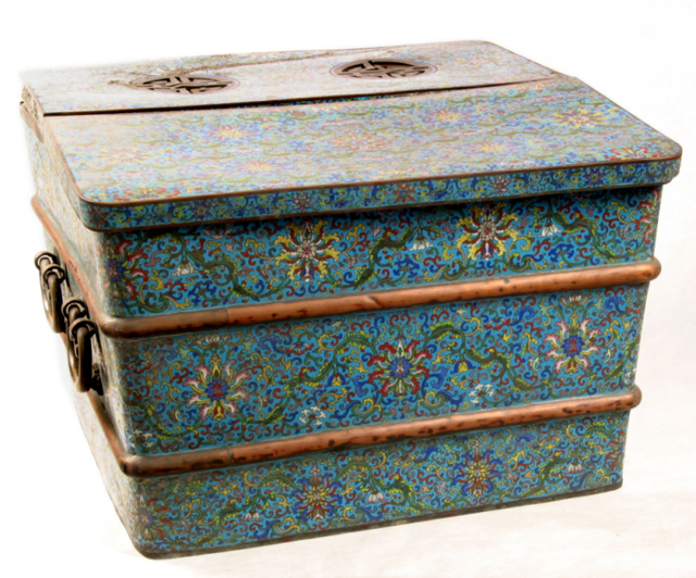“清掐丝珐琅蟠龙透雕宝相花兽耳方冰箱”。