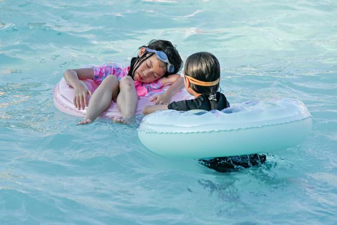 2025年7月5日,上海,小女孩闭着眼睛躺在救生圈上休息。澎湃新闻记者 朱伟辉 图