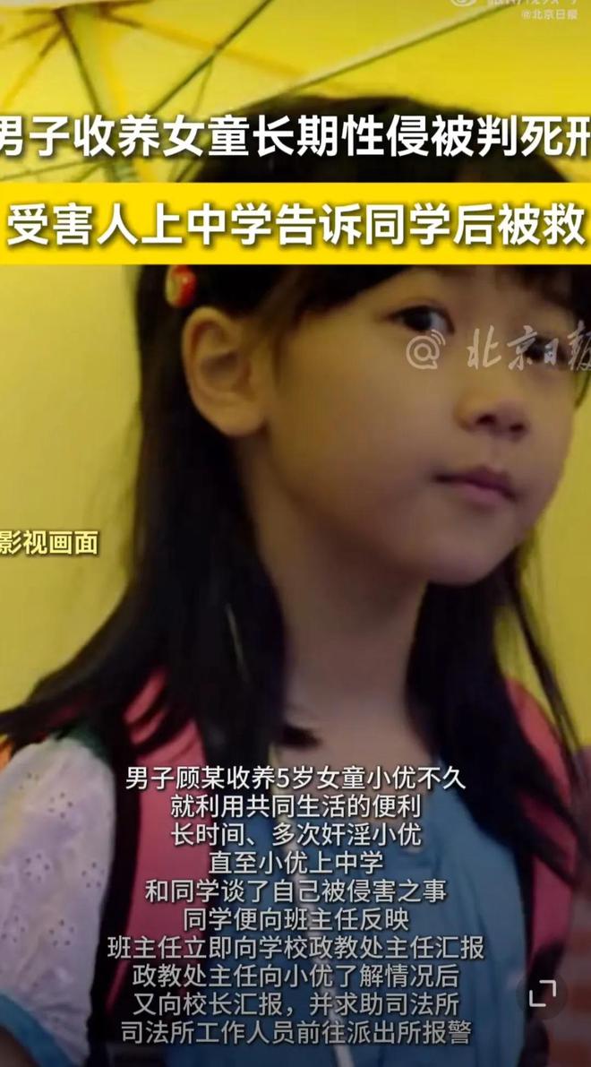 直到小优升入中学,一次和同学闲聊时,她无意间提起“和爸爸睡觉不穿衣服亲亲”的事,以为这是正常家庭的相处模式。同学却意识到事情不对,立刻告诉了班主任。班主任追问小优后,迅速按流程上报学校政教处,校方向司法所求助后,司法工作人员当天就向派出所报了警。警方介入调查后,顾某不仅承认了对小优的长期侵害,更交代出在收养期间,还通过其他途径对4名未成年女孩实施过性侵害。最终,顾某因强奸罪、猥亵儿童罪被法院判处死刑,这个结果让不少知情者直呼“大快人心”。