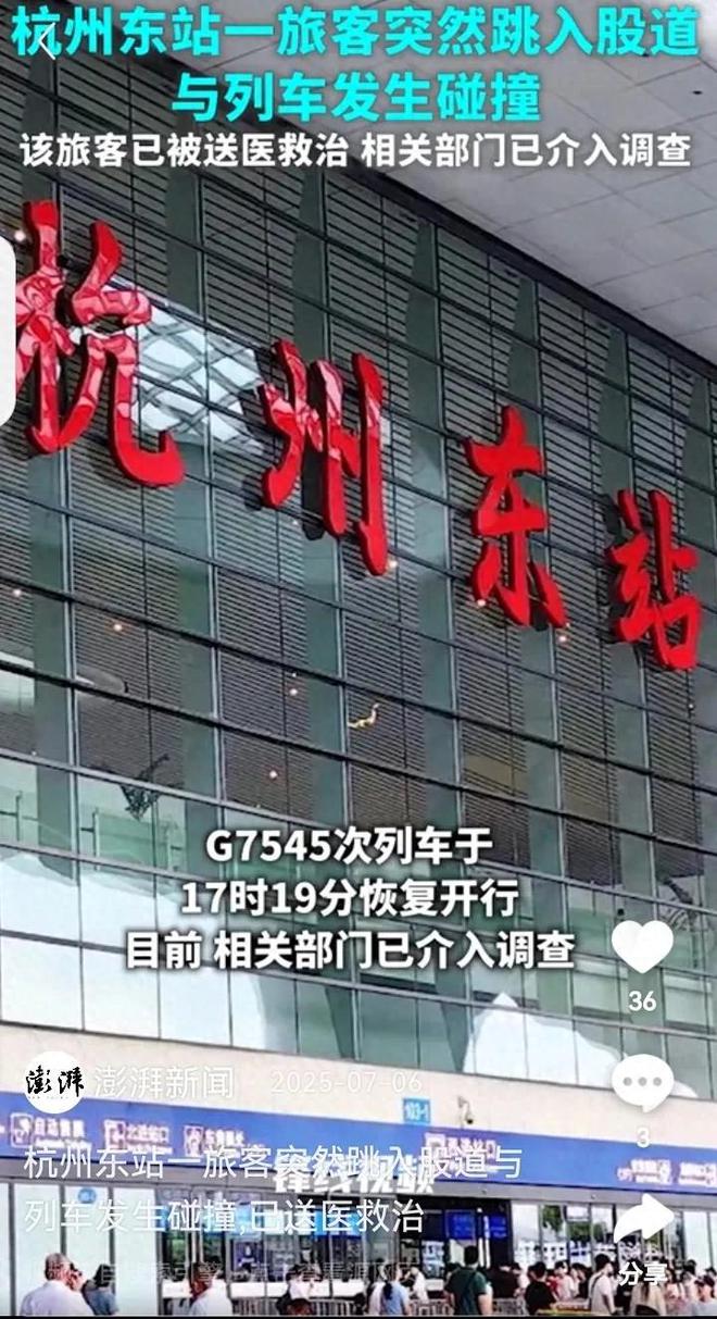 7月5日下午四点多钟的杭州东站,正是人来人往的热闹时候,此时,G7545次列车正慢悠悠地往25号站台开过来。但谁也没料到,就在车头刚要停稳的当口,站台上一个穿浅色衣服的男子突然跨过了黄色安全线,身子一矮就跳了下去,直接栽进了铁轨中间。这一幕发生得太快,旁边等车的人还没反应过来,就听见列车司机猛地拉响了警报,尖锐的刹车声“吱——”地划破了车站的嘈杂。