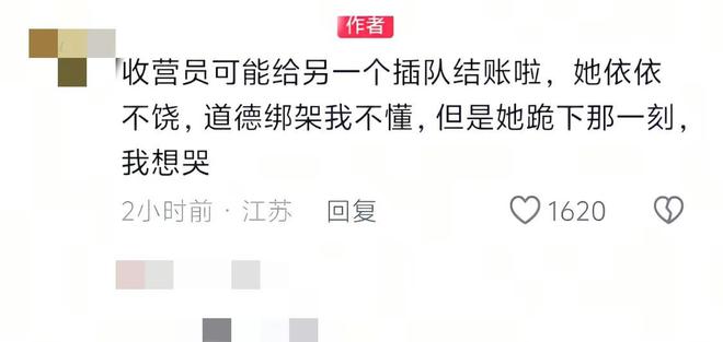 这段9秒的视频在网上发酵后,网友的评论像炸开了锅。有人替收银员委屈:“看了视频想哭,一份工作而已,不至于用下跪来解决吧?”这话戳中了不少打工人的心事——谁不是为了生计在奔波,可再怎么说,膝盖底下也是尊严啊。也有网友觉得顾客太较真:“插队固然不对,但逼着人下跪是不是过分了?”有人翻出监控细节分析:“收银员其实是好意,看拿啤酒的顾客拎着沉,想行个方便,可惜没提前沟通。”