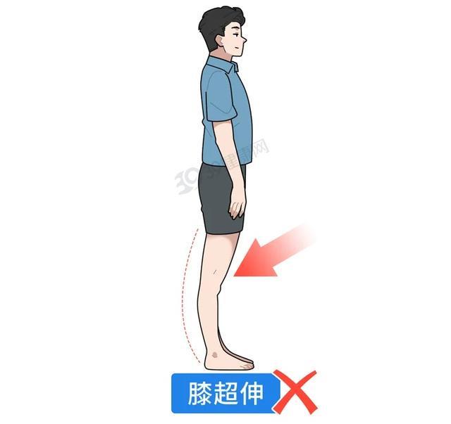 这种膝盖过度后顶的站姿会让关节承受异常压力,加速磨损与老化。同时,由于重心前移,稳定性变差,摔倒受伤的风险也增加了。