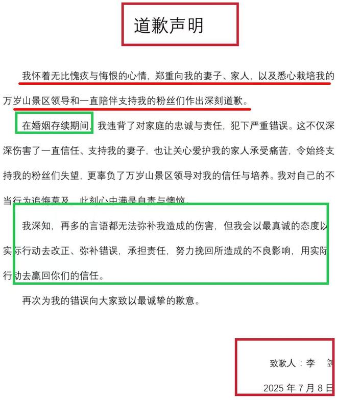 直到7月8号下午,原来的蓝狐狸李某剑才在社交账号给自己的老婆、家人、景区和粉丝都道了歉。只是这个道歉来得有点晚,早干嘛去了?当初在粉丝群里还辩解自己“不算隐瞒”,这会儿才想起认错,不少人觉得“诚意不够”。