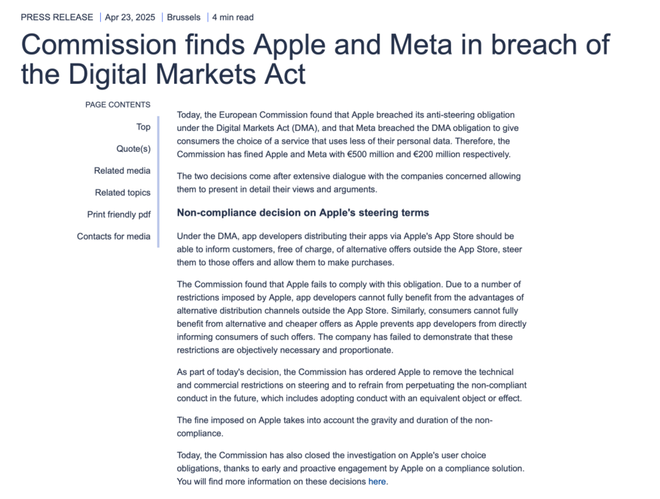 但在欧盟委员会看来,苹果的这些措施仍有碍公平竞争原则。今年 4 月,欧盟再度对苹果处以 5 亿欧元的罚款,理由是苹果违反了 DMA 法案中的“反引导义务”。这是 DMA 法案下开出的首份罚单。