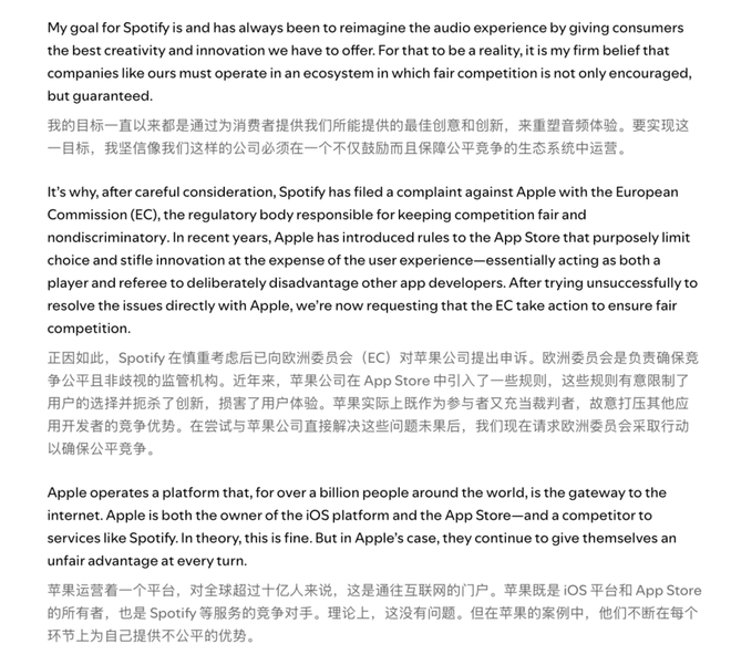 但针对“苹果税”的调查展开得更早。2015 年,全球最大的流媒体音乐巨头 Spotify 就开始向欧盟委员会控诉苹果不正当竞争,反对苹果高达 30% 的抽成比例,并在 2019 年正式向欧盟委员会递交诉状。Spotify 创始人 Daniel Ek 多年来不断抨击苹果存在不正当竞争行为,称苹果既当裁判员又当运动员,故意挤压其他应用开发者。