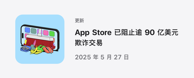 5 月 27 日,苹果最新对外发布的一封关于 App Store 的新闻稿中强调,过去 5 年 App Store 累计阻止了超过 90 亿美元的欺诈交易。苹果称,仅在 2024 年他们就阻止了超过 20 亿美元的欺诈交易,并拦截了近 200 万次的高风险 app 申请。