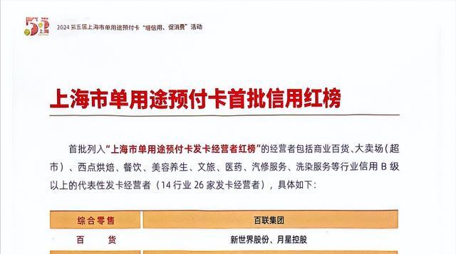 2024年5月,上海市还公示了单用途预付卡首批信用红榜,涵盖百货、连锁大卖场、酒店、文旅、中餐、西式快餐、咖啡茶饮、西点烘焙、服装、美容养生、医药、汽修、洗染等行业,信用B级以上的代表性发卡经营者,共26家。