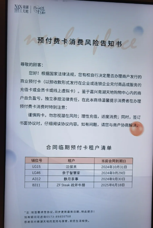 7月8日,华商报大风新闻记者梳理发现,社媒上不少网友发帖,2024年起,全国多地都有不同的商场公示《预付卡消费风险告知书》。除浙江杭州外,浙江嘉兴、江苏如皋大型商场也有商业预付卡的提示,公示了商家位置、到期时间等。