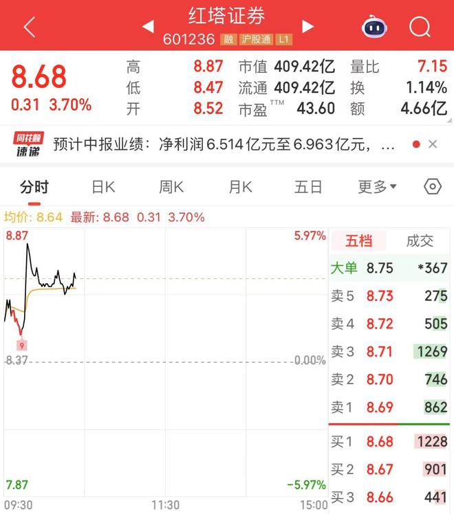 盘面上,今日红塔证券股价高开,一度涨超5%。截至发稿,涨幅回落至3.70%,报8.68元/股,总市值409.42亿元。