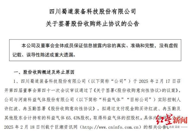 关键条款未达成一致,蜀道装备拟终止收购科益气体