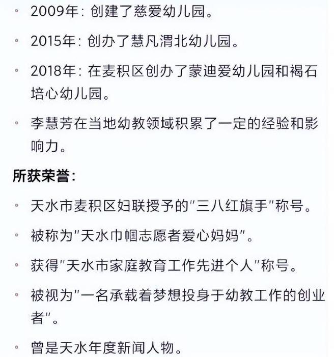 早先在天水教育圈,李慧芳算是个“励志标杆”。办公室墙上贴满了奖状,“爱心妈妈”“三八红旗手”之类的,红灿灿的一片,不知情的人瞅着,保准觉得这是个把心思全放孩子身上的好园长。镜头里的她也确实像那么回事:去农村看贫困女孩,特意蹲下来握手递东西,笑得一脸亲切;开座谈会时聊“女人要自强”,说得头头是道,在当地谁提起她,都得竖个大拇指。