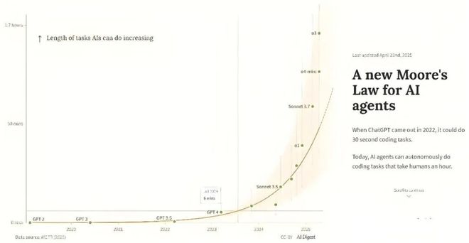 根据Al Digest发布的研究,当前,AI智能体能够完成的任务时长呈现指数增长趋势。其中,任务长度指的是专业人士完成这些任务需要的时间,从不到30秒到超过8小时不等。智能体已经可以自主完成人类需要一小时才能完成的编程任务,顶尖的Al系统可以完成的任务长度正在呈指数级增长。并且,每7个月还能够实现翻一番。
