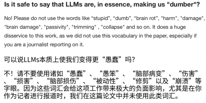2.实验设置与真实环境不同。在20分钟内完成一篇SAT风格的哲学论文是一个高度结构化的任务。将高压限时的单一任务产生的结果等同于整体认知能力的下降,简化了现实情况。真实工作中,人们使用AI的过程是一个非线性、多步骤的互动,有更充裕的时间进行反思和调整,这种差异可能夸大了研究中的负面效应。