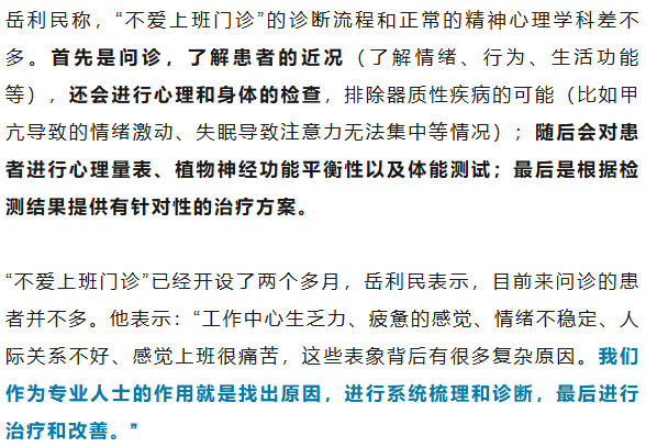 记者采访了正在“不爱上班门诊”值班的医生——该院睡眠心理科主任岳利民。他透露,该门诊是在患者建议下开设的。“之前有孩子来看‘不爱上学门诊’,家长说不爱上学有人管了,不爱上班有人管吗?平时他们也因为工作而身心疲惫。我们在接诊过程中也发现,有的人不爱上班其实背后存在焦虑、抑郁等问题。但直接说这与焦虑症、抑郁症有关,患者可能有病耻感,所以我们在今年设立了一个‘不爱上班门诊’,现在已挂牌两个多月了。”