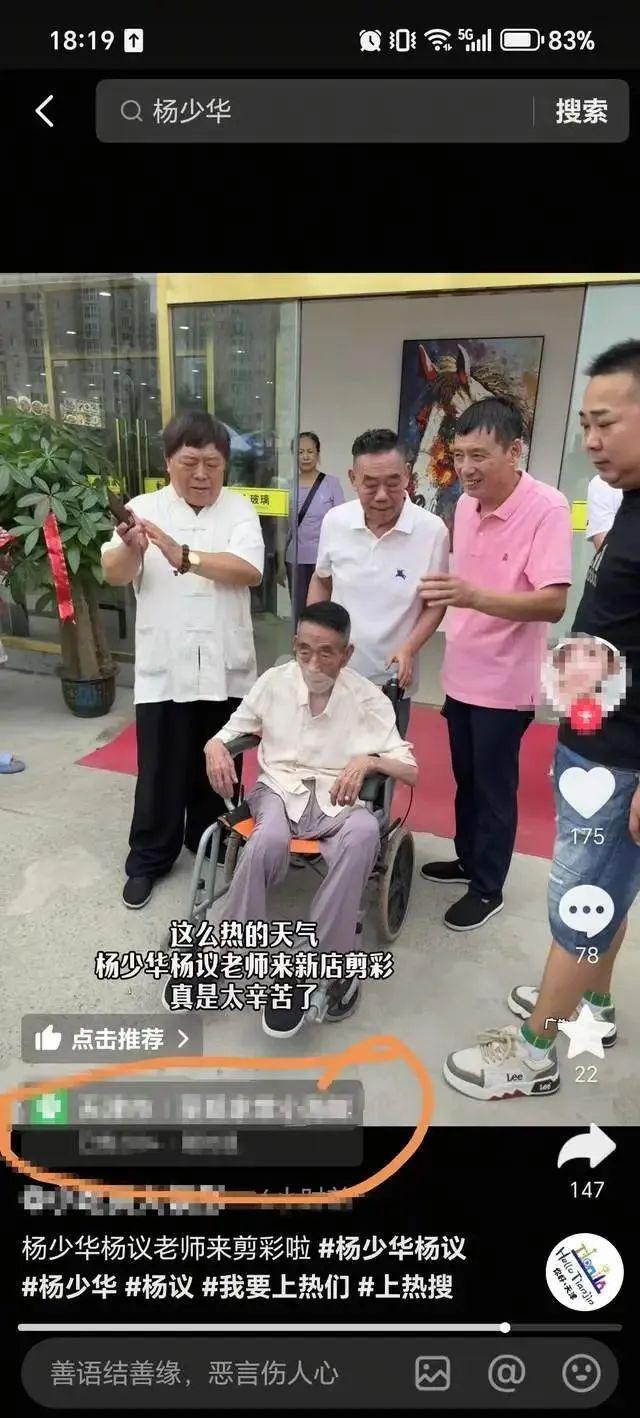 在社交平台上,7月9日上午,杨少华还参与了天津一家饭店的剪彩。视频显示,杨少华坐着轮椅,身后有几人陪同。
