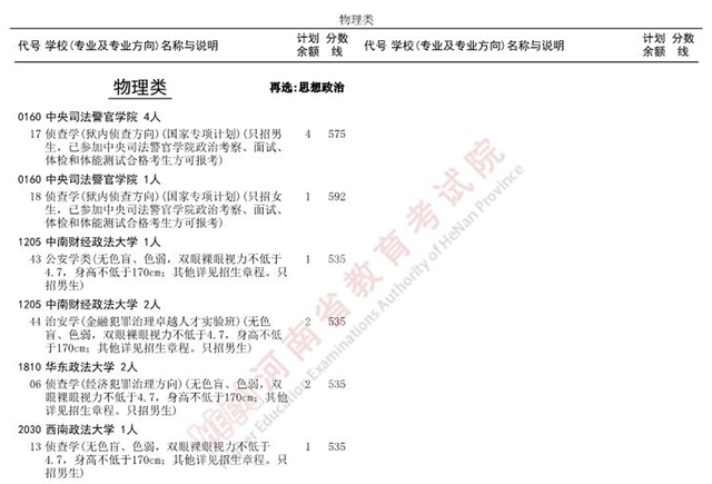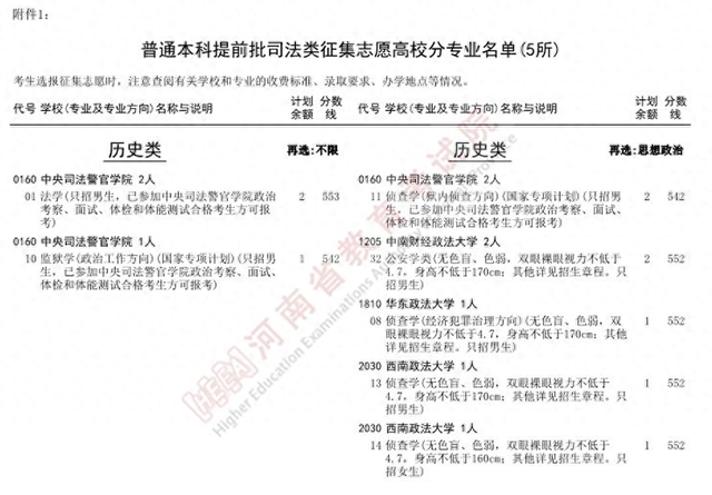 1.中央司法警官学院要求政治考察、面试、体检和体能测试均合格,国家专项计划专业要求须具有相应的报考资格;西南政法大学、中南财经政法大学、华东政法大学要求考生文化成绩达到特殊类型录取控制分数线,西北政法大学要求考生文化成绩达到普通本科批录取控制分数线。