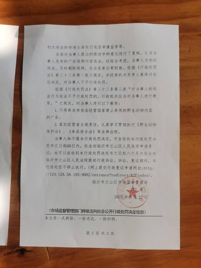 “我当时在外地,说一周左右回去处理,对方同意了。”张女士说,电话挂断后,她便删除了视频。不久,兰山区市监局将一份3月24日出具的《行政处罚告知书》,通过居委会送到张女士的饭店。
