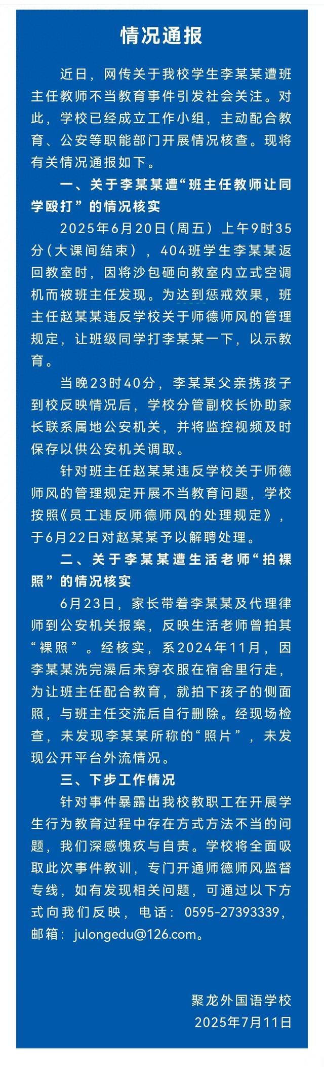 “网传关于我校学生李某某遭班主任教师不当教育事件引发社会关注。对此,学校已经成立工作小组,主动配合教育、公安等职能部门开展情况核查。”7月11日晚,该校就家长在网络投诉的事情作出回应:涉事班主任已被解聘,学生裸照未外传。