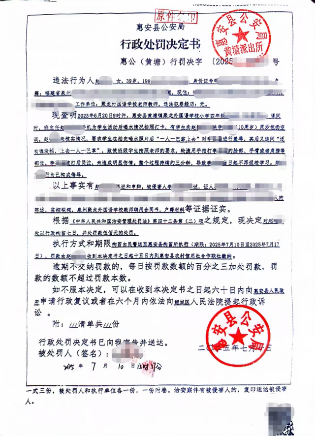 李先生向华商报大风新闻提供了警方的处理结果,上面写道:现查明,2025年6月20日9时许,惠安县黄塘镇聚龙外国语学校小学四年级班主任赵某某用手机为学生活动后喝水情况拍照打卡时,有学生向赵某某反映李某某(10周岁)用沙包砸空调,赵某某未核实情况,要求学生在拍完喝水照片后“一人一巴掌上去”对李某某进行羞辱,其后又追问谁没打,让上去一人一巴掌,致使班级学生按照老师的要求,轮流用手拍打李某某的脸部、手臂等部位。李某某被打后哭泣,未造成明显伤情。整个过程持续约三分钟,导致李某某当日起不再返校学习,赵某某的行为已构成侮辱。警方对赵某某作出行政拘留七日的决定。