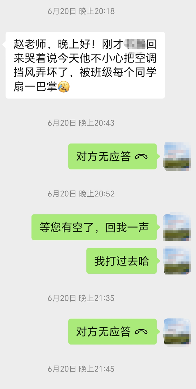 他给华商报记者发了大量妻子手机微信中与班里每一位学生家长的聊天记录,内容有对孩子们成长的鼓励,也有对孩子们闪光点的赞许。即便是对这位学生,从聊天记录中也能看到他妻子和学生家长的对话充满了对孩子的关爱。直到6月20日晚,这位家长发消息:“赵老师,孩子刚回来哭着说今天他不小心把空调挡风弄坏了,被班级每个学生扇一巴掌。”约半个小时后,班主任向这位孩子的母亲发语音通话,未获应答。之后微信聊天记录显示,事发后班主任持续多日向其母亲解释、道歉,均未得到任何回应。“打电话也不接,事发后,这位家长拒绝和我妻子接触,不听任何解释。”他说。