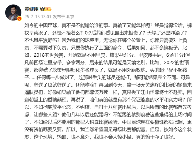 15日,知名足球评论员黄健翔在社媒发长文评论国足表现。