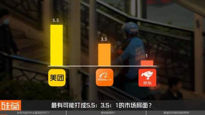 第二种可能性,是美团和阿里形成双寡头的格局,它们俩占到市场的90%,而京东成为远远落后的第三名。这种情况下,阿里会在未来12个月投入500亿,疯狂从美团手里抢夺订单,美团只能保持微弱的领先,形成4.5 : 4.5 : 1的格局。