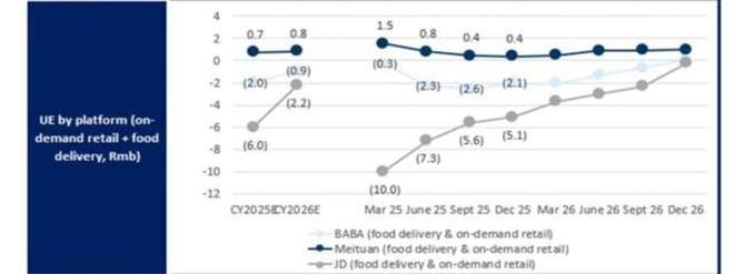 三家平台的UE模型:浅蓝色-阿里巴巴;深蓝色-美团;灰色-京东。数据来源:高盛