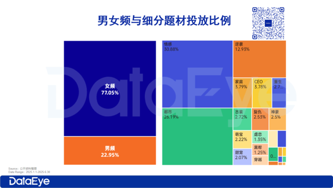 据DataEye-ADX的海外短剧版数据:2025年H1,海外短剧作品类型仍以女频为主,男频和女频的比例约为3:1,女频素材占比达77.05%,男频素材占比为22.95%。