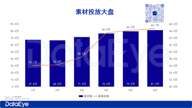 从月度趋势来看,每月素材投放量稳定攀升,4-6 月每月环比增长约 4%-5%,整体呈现 “先稳后升,增速逐步收窄但持续增长” 的态势。