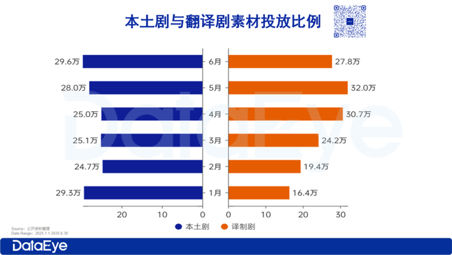 据DataEye-ADX海外短剧版数据,2025年上半年,海外在投本土剧素材161.6万组,译制剧素材150.6万组。