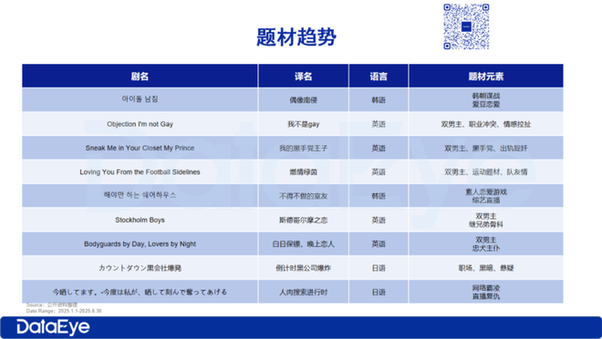 女频题材与都市、情感的组合,成为全球通行的爆款公式。CEO题材是海外本土剧的热门题材选择。 值得关注的是:上半年国内市场热门的系统、科幻、赘婿等题材在海外受众接受度较低,均未进入TOP10行列。