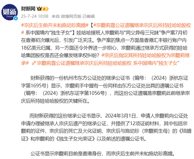 最新消息,宗馥莉被证实拥有香港身份,有关宗庆后和施幼珍的婚姻状况也引起关注,公证书显示他们并未离婚,这些新爆料引发了公众对于这一家族内部事务的关注和猜测。... 最新消息,宗馥莉被证实拥有香港身份,有关宗庆后和施幼珍的婚姻状况也引起关注,公证书显示他们并未离婚,这些新爆料引发了公众对于这一家族内部事务的关注和猜测。