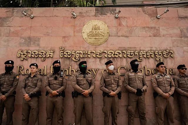 此前报道:当地时间2025年7月20日,泰国曼谷,泰国警察在柬埔寨驻曼谷皇家大使馆外站岗。(视觉中国)