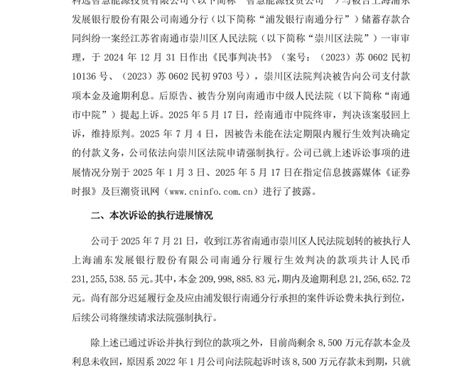 此前,科远智慧子公司公告起诉浦发银行南通分行储蓄存款合同纠纷一案已获得二审胜诉,但在执行环节受阻,本次公告更新了部分执行款的到位。关于诉讼经过,2024年12月31日,南通市崇川区人民法院判决浦发南通分行向科远智慧全资子公司南京科远智慧能源投资有限公司(下称“南京科远”)支付存款本金2.95亿元及逾期利息,诉讼费由银行承担。2025年5月17日,南通市中级人民法院终审维持原判,认定银行未尽到对存款质押的审核义务,需承担全部责任。