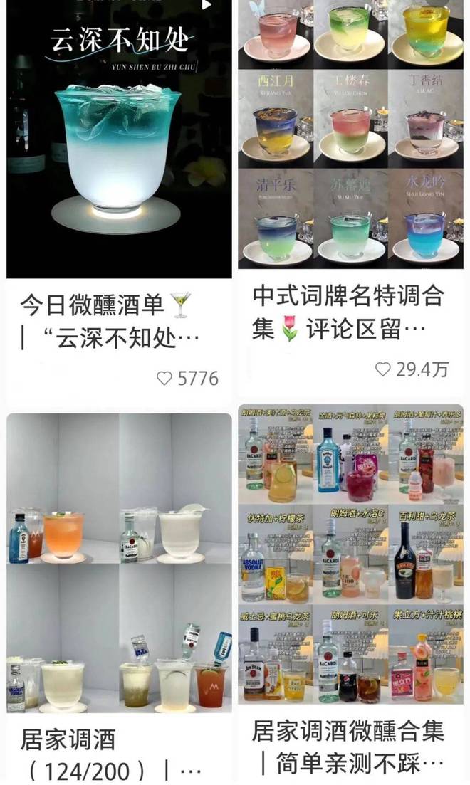 在小红书上,搜索居家调酒,味全每日C、元气森林的葡萄气泡水、养乐多、旺仔、茶π、雪碧、可乐、甚至东方树叶们,都被各博主放到盛满冰块的玻璃杯中,并放进各种吃火锅、闺蜜聚餐、入夏必备仪式感等的场景里,最后落笔“享受微醺的快乐”。