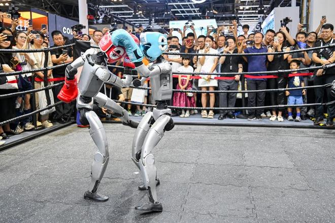 2025年7月26日,上海世博展览馆,宇树科技G1格斗机器人在进行拳击比赛。澎湃新闻记者 朱伟辉 图