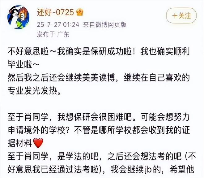 真正让舆论再次沸腾的,是2025年7月27日杨某媛的那条动态。她在帖中称自己通过了法考,成功保研,即将“美美读博”,末了还带着一丝嘲讽:“肖同学保研会很困难吧”。这几句尖刻的话,像一根火柴点燃了积压已久的情绪。