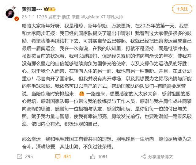 2025年1月1日,据中新网消息,“雅思组合”黄雅琼发文称,已经向国家队提交了退出申请。