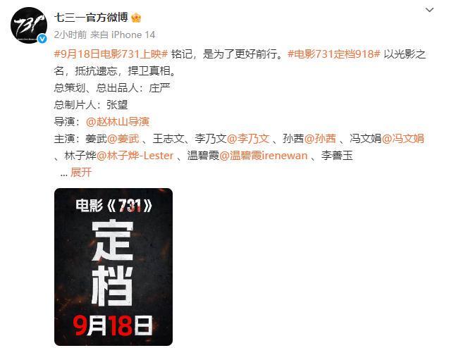 电影《731》定档9月18日,山河已无恙,吾辈当自强,真相不能忘。铭记历史!