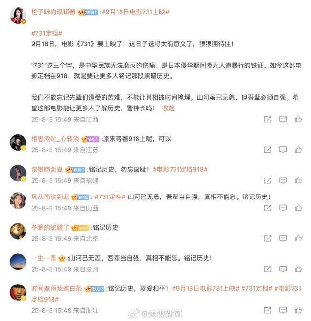 今天,《731》定档,电影《731》将于9月18日正式上映。网友刷屏的评论看得落泪。“别回头,向前走,出口有光,有人间烟火,有国泰民安。别忘来时路!”